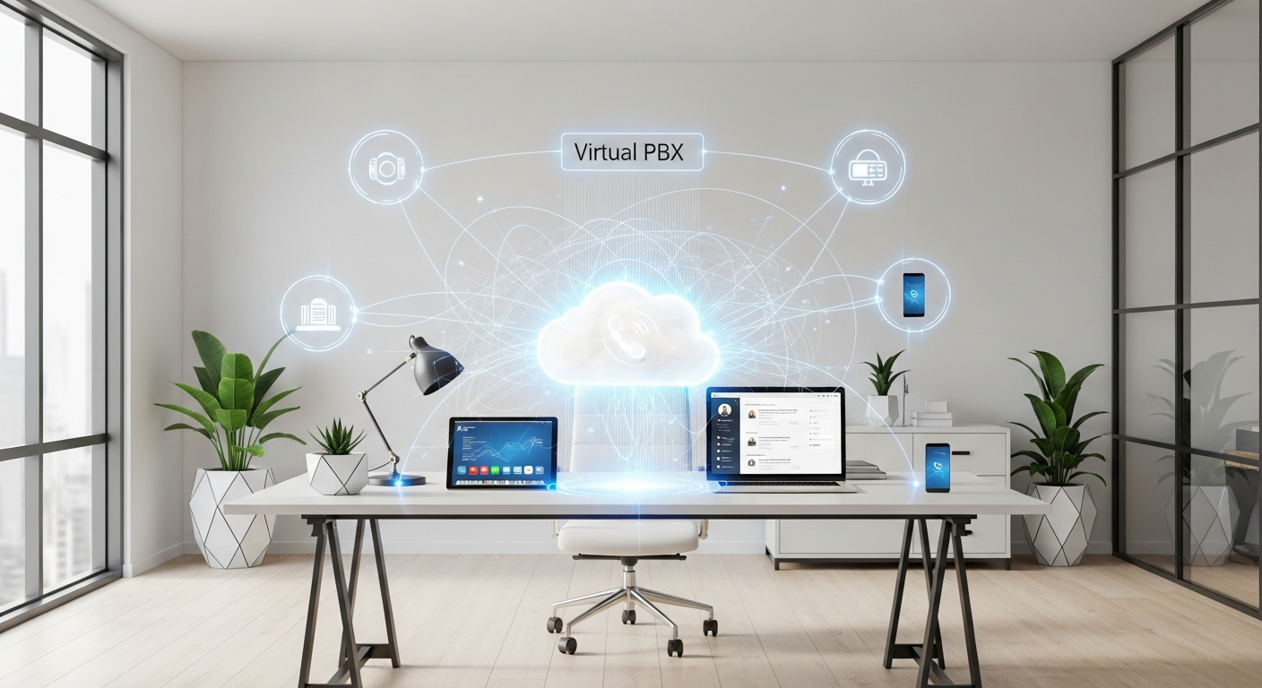 A virtual PBX is a cloud-based phone system that provides all the call handling features of a traditional PBX, including auto attendants, call routing, voicemail, call recording, and extension dialing, without any on-premises hardware. Employees use softphone applications on their laptops, tablets, or smartphones to make and receive calls using the company's business phone numbers. The system runs entirely in the cloud, scales up or down with a few clicks, and costs a fraction of a traditional phone system.