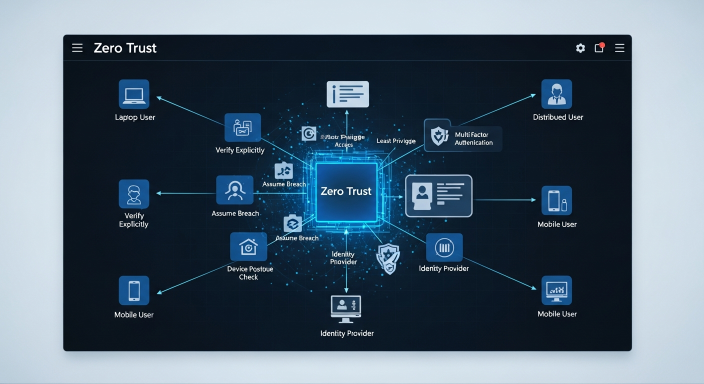 Zero trust operates on three core principles: verify explicitly, use least privilege access, and assume breach. Verify explicitly means that every access request is authenticated and authorized based on all available data points, including user identity, device health, location, time of day, and the sensitivity of the resource being accessed. Least privilege means granting only the minimum access necessary for the specific task. Assume breach means designing systems so that a compromised account or device cannot laterally move to access additional resources.